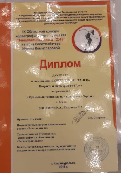 Образцовый хореографический коллектив «Чердак» образован на базе МАУ ДК ГО Ревда в 2007-м году. «Чердак» уникальный самобытный коллектив, постоянный участник городских массовых мероприятий, многократный победитель всероссийских и международных конкурсов. Первый на территории города начал продвигать идею современного танца, постоянно обучаясь и развиваясь, пробуя коллаборации со смежными видами искусства. На базе коллектива проводятся мастер-классы, как с российскими, так и иностранными хореографами. Наша отличительная черта многоплановость, танцовщики прекрасно владеют техниками contemporary dance, эстрадного танца, а также hip-hop, бачата, свободный танец, модерн, импровизация, контактная импровизация, акробатика, джаз-фанк, dancehall, vogue, street dance. В нашем репертуаре 7 полноценных спектаклей для детей и более 150 танцевальных номеров. В коллективе занимается порядка 100 человек, работают 8 основных педагогов и 4 приглашенных, среди которых профессиональные артисты. Нам интересно продвигать актуальные темы, говорить со зрителем языком сегодняшнего дня, учиться новому и совершенствоваться уже в приобретённых навыках.